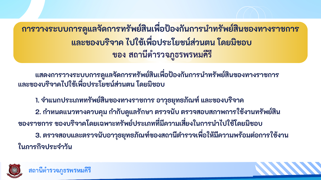 แสดงการวางระบบการดูแลจัดการทรัพย์สินเพื่อป้องกันการนำทรัพย์สินของทางราชการและของบริจาคไปใช้เพื่อประโยชน์ส่วนตน โดยมิชอบ